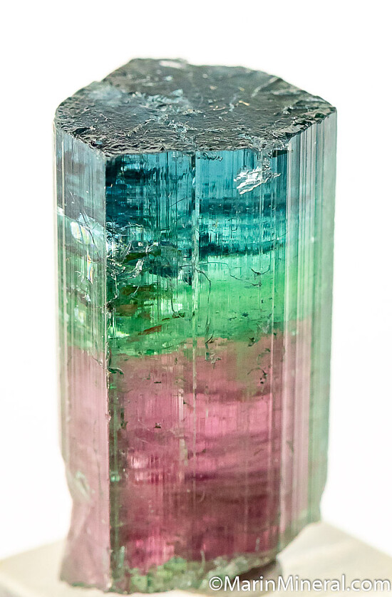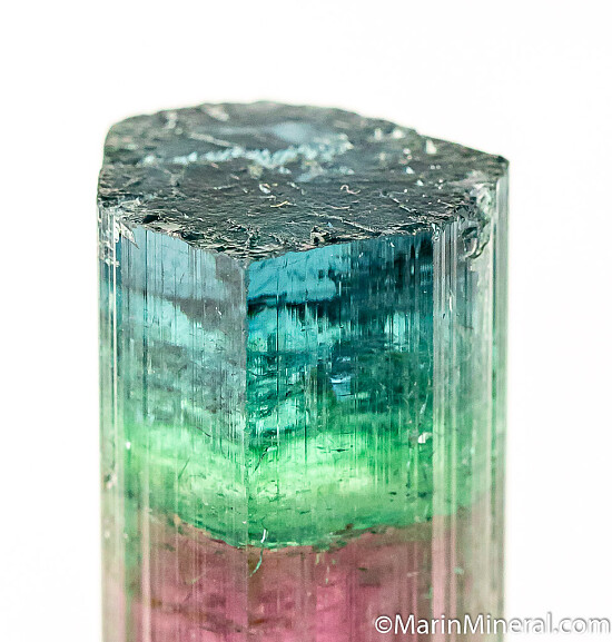 Blue-cap Tourmaline crystal from the famous Sapo Mine. The lower core is red, followed by a blue/green zone then a deep blue termination. Complete all around and undamaged except for one trivial edge chip. Weighs 7.37 grams.