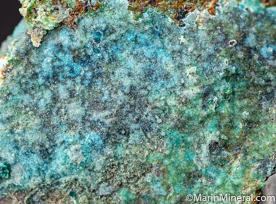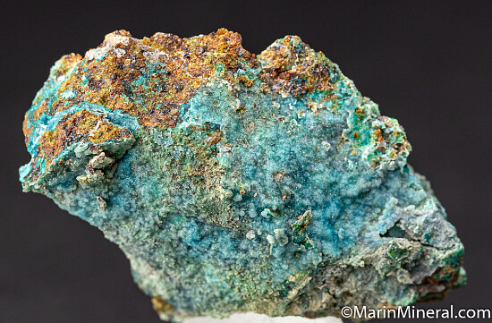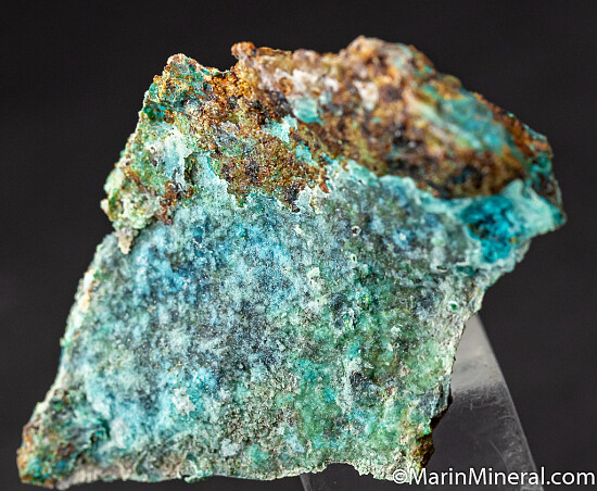 Specimen covered on nearly all sides by bright blue Chrysocolla covered by a thin layer of Quartz. A colorful and uncommon specimen from an obscure Nevada copper mine.