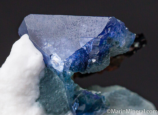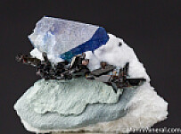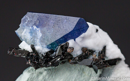 A gemmy blue Benitoite crystal with Neptunite crystals. The benitoite shows 1.2cm from the front, but is part of a lager crystal which can be seen on the backside. Good blue color with areas of transparency. This is is essentially a one locality species and the mine is closed, get your specimen of the California state gem while you can.
