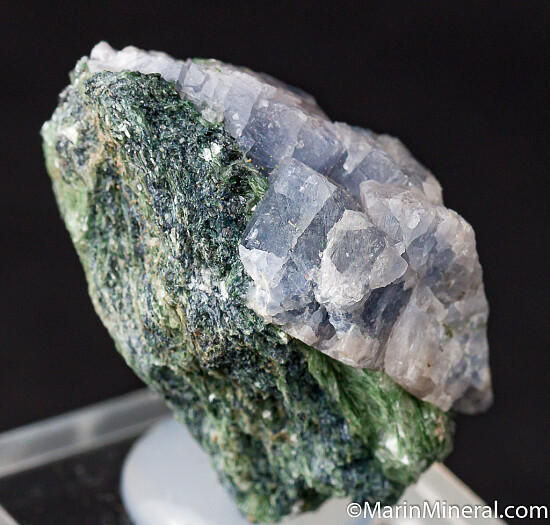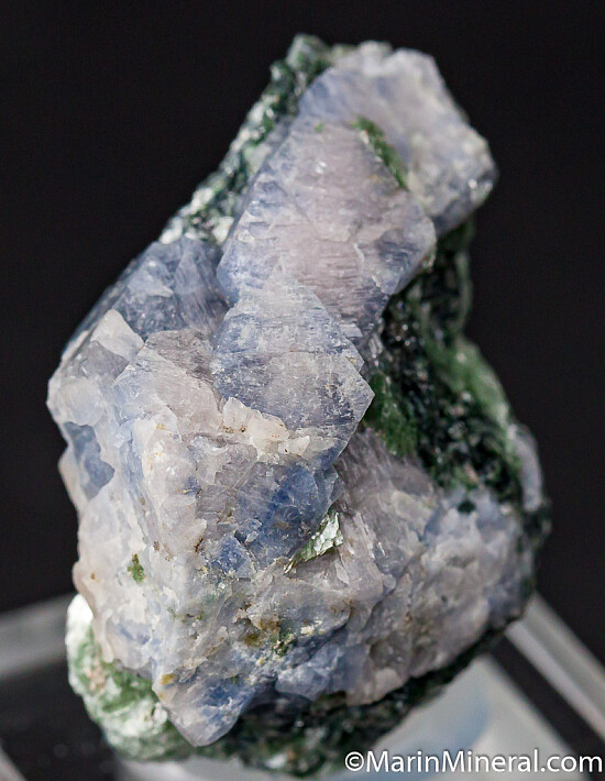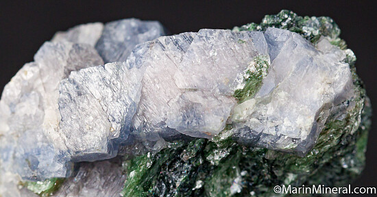 Blue Lawsonite crystals on a green schist matrix from the type locality in Marin Co., California. The crystals display good lustrous faces rather than more commonly seen broken surfaces. This is an old Chuck Trantham specimen. His old label notes that it was collected by him and Al McGuinness back in 1968.