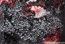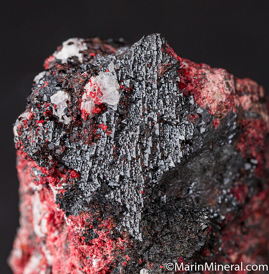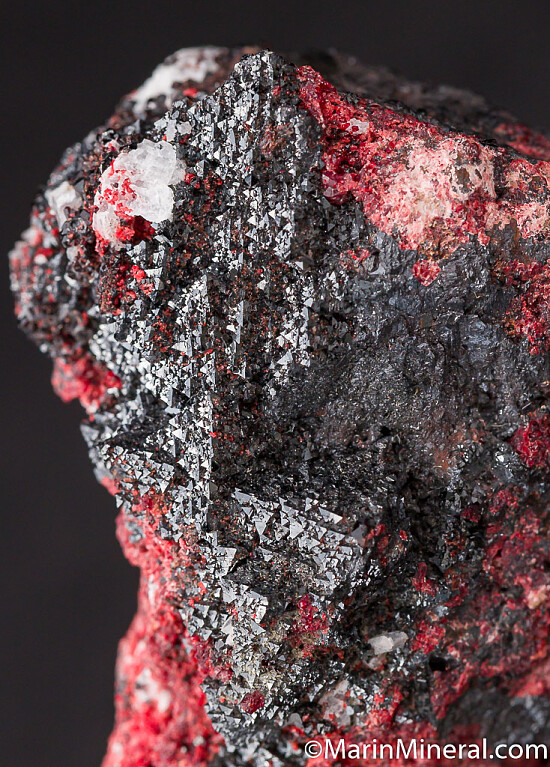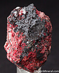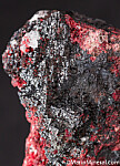 Shiny black pyramidal crystals of Hausmannite that contrast well against a red Andradite matrix. A classic from the Kalahari manganese fields. Valued at $200.