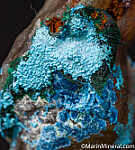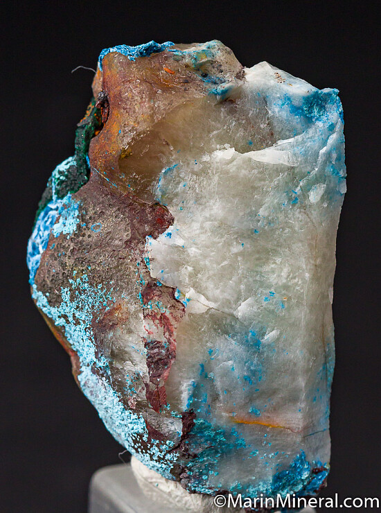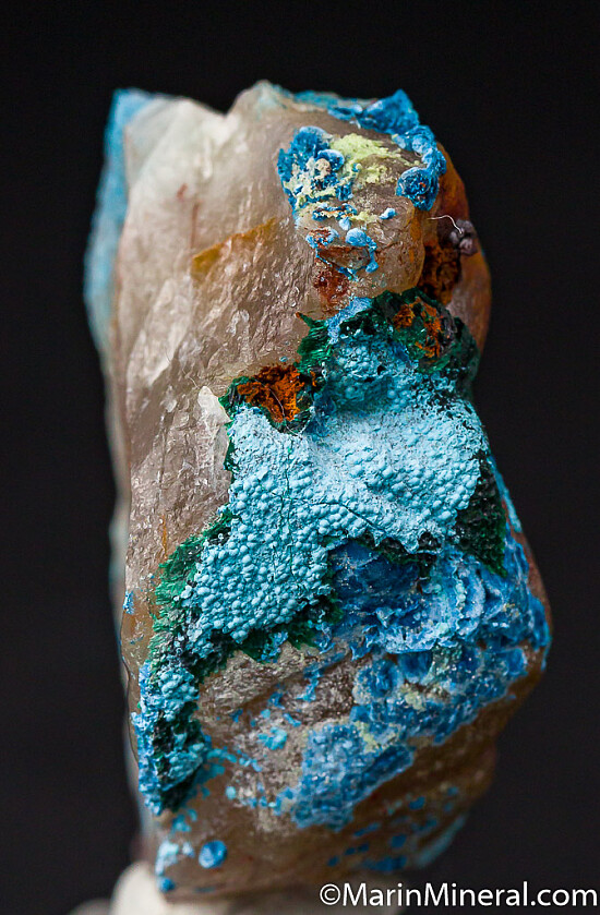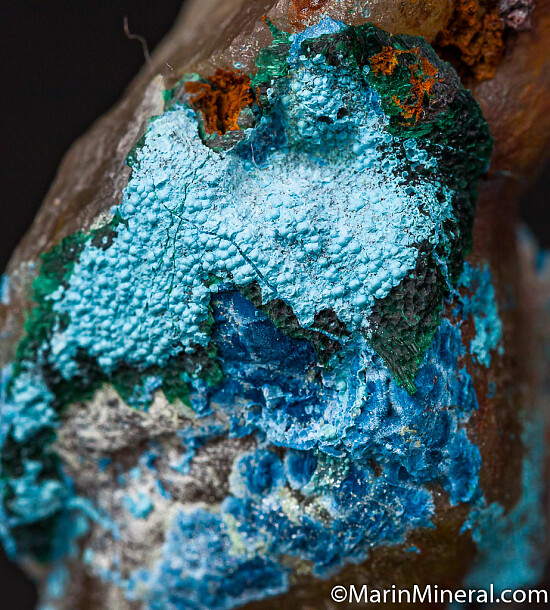 Colorful specimen of dark blue Shattuckite, light blue Chrysocolla, and green Malachite on Quartz.