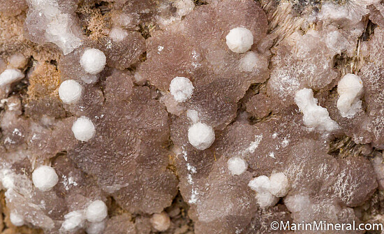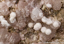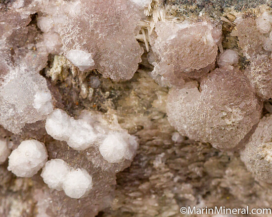 White spheres of Phillipsite on sparkly Gismondine on dark grey basalt creating a specimen with both variety and sparkle. Both Phillipsite and Gismondine are uncommon Zeolite minerals.