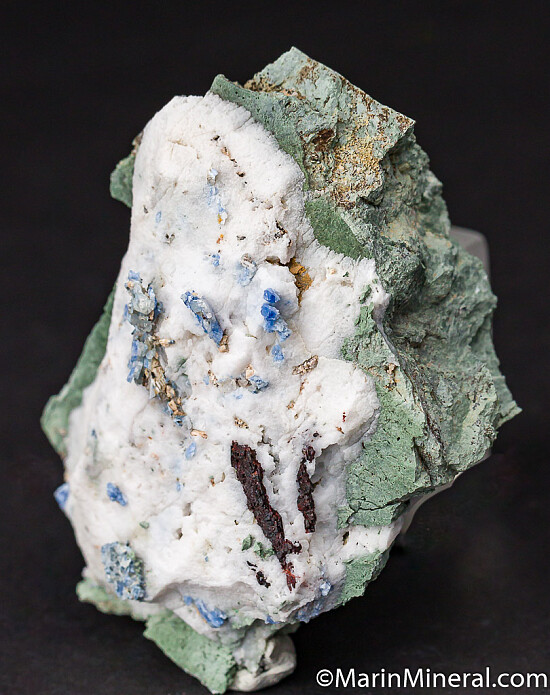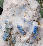 Benitoite crystals and Neptunite crystals exposed in white Natrolite on matrix. The are many Benitoite crystals, about 12 or so and many tiny ones, all a light blue color.