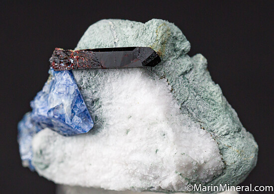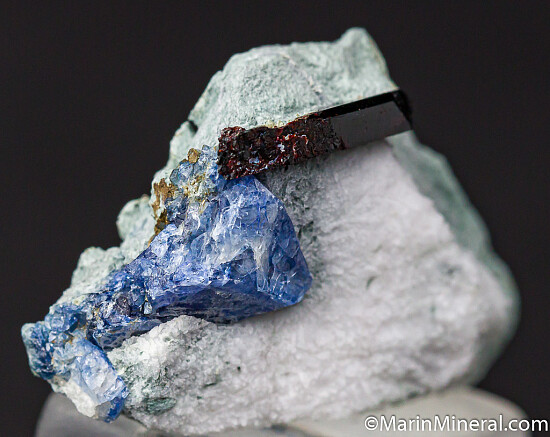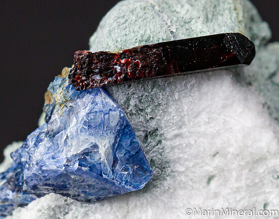 Benitoite and Neptunite on matrix with white Natrolite, a California classic. The Neptunite is just over 1cm long, perfectly terminated, and sits horizontally across the top of the Benitoite.