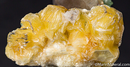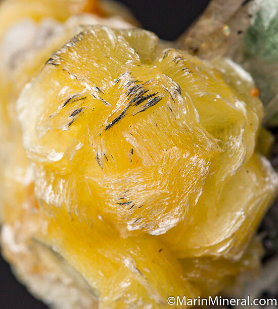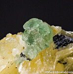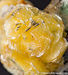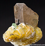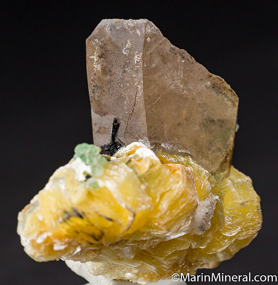 Thick books of yellow mica, really nice crystals, along with Schorl and Fluorite grown atop the tip of a smokey Quartz crystal. It's photogrpahed from a variety of angles, but I would display it with the bottom of the Quartz at the bottom and the mass of mica and other crystals rising up off the tip of the Quartz, it looks pretty neat that way. The mica crystals reach 1.1cm in size.