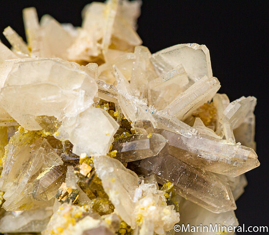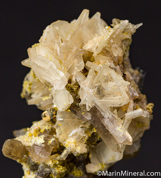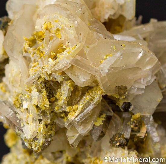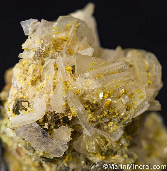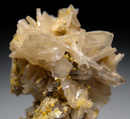 Rich specimen of Bertrandite associated with Quartz crystals, small Pyrite crystals, and yellow mica. The Akchatau mine is famous for purple creedite, smoky quartz and mixed specimens of purple fluorite, Apatite and Bertrandite, though specimens from this mine are not commonly seen anymore.