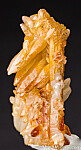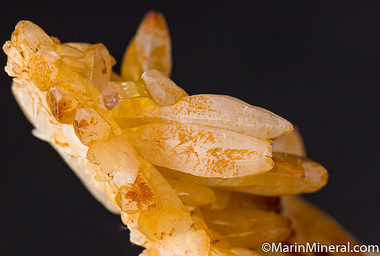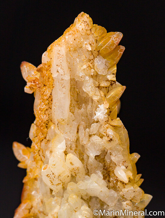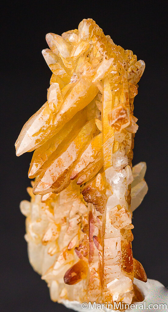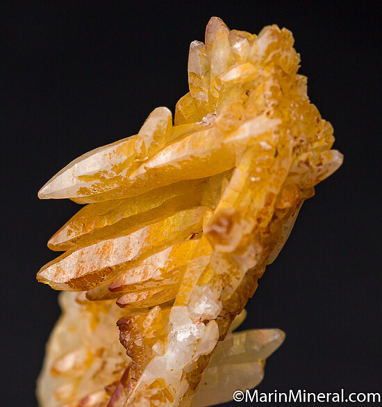 Cluster of highly elongated white Calcite crystals from the Kalahari manganese fields. Well crystallized all around with some surface coloration due to iron.