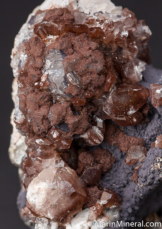 Clusters of transparent Calcite crystals on a matrix of bubbly black Goethite. The Calcite crystals are partially colored brown due to unidentified inclusions. A good addition to a Kalahari Manganese field locality suite.