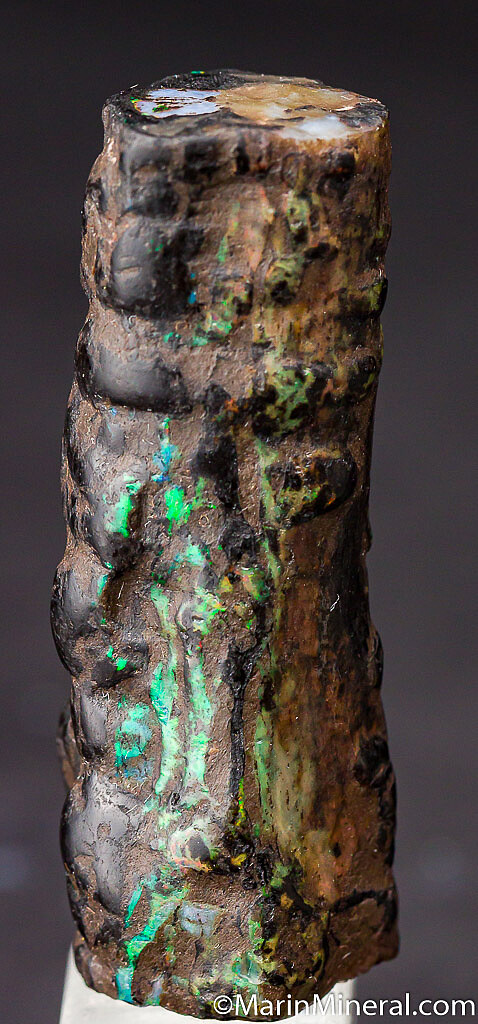 Black opal that has completely replaced a section of fossil Bamboo from recent finds in Java. It has a bright play of color (reds, blues, and greens) in areas and also shows fine detail of the former bamboo. These were found in the past 2 years and are uncommon.