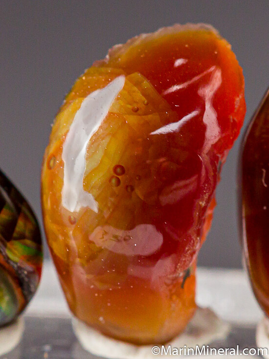 Three polished specimens of Fire Agate with bubbly looking irridescent 'fire' beneath clear Quartz.