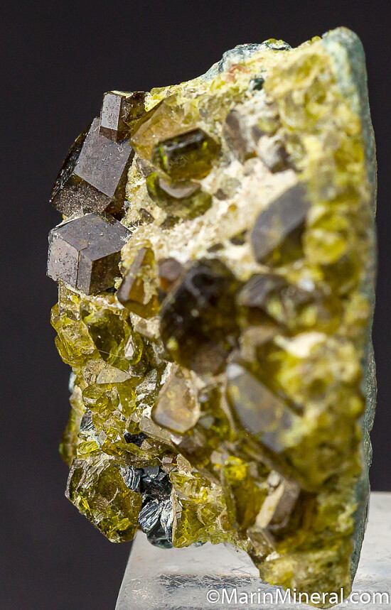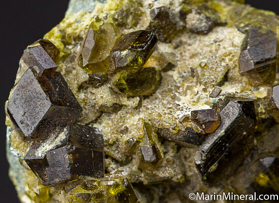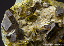 Green Andradite crystals to 7mm covering matrix. The Andradite range from light green to medium green and are translucent to transparent. Associated with Clinochlore.