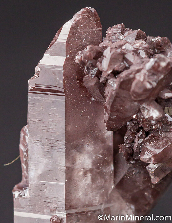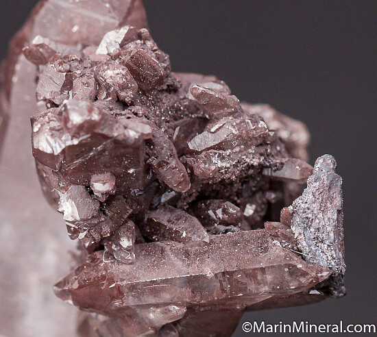 Cluster of transparent Quartz crystals with attached Hematite or Manganite. A good addition to a Kalahari Manganese field locality suite.