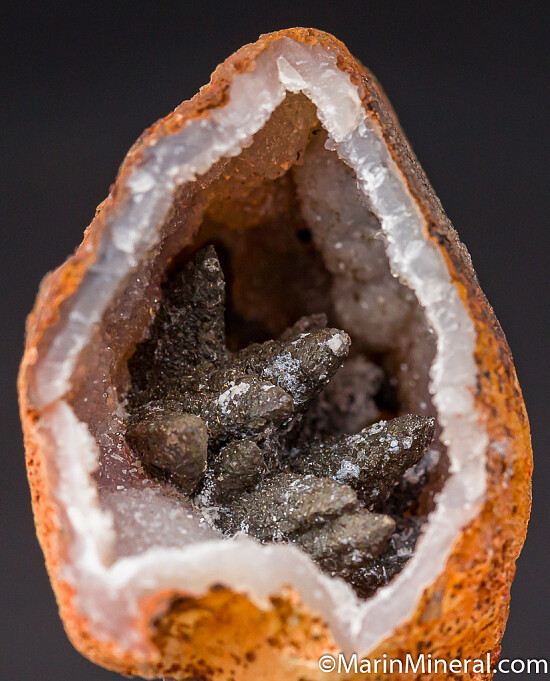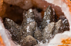 Cluster of scalenohedral Calcite crystals in a drusy Quartz lined geode. Old specimen.