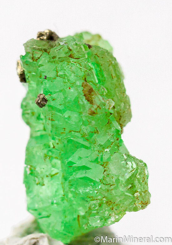 Small but fine specimen of faden Tsavorite composed of a few intergrown stacks of crystals, undamaged and complete all around. Has a good medium green color and is translucent to transparent with small attached crystals of Pyrite adding color. These were found recently (past few years) and are really remarkable specimens of Tsavorite, the chromium and vanadium rich variety of Grossular.