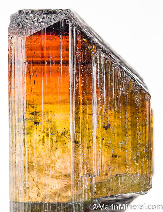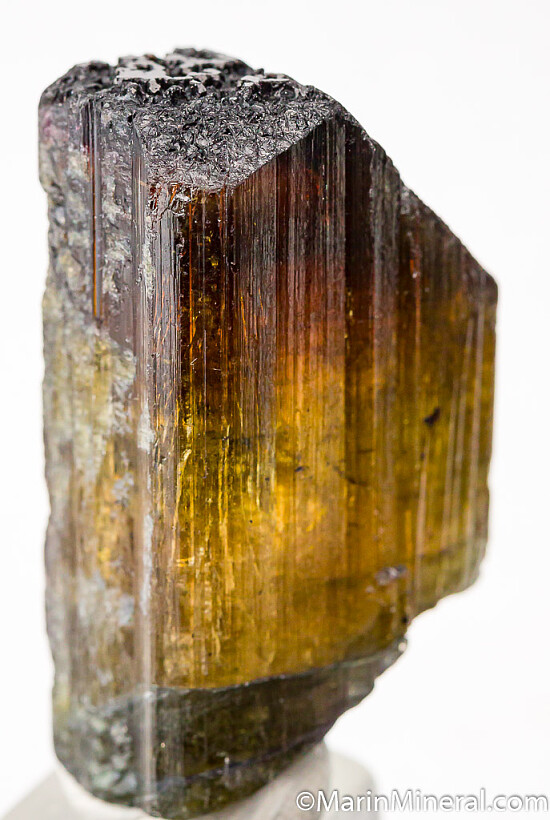 Transparent single Liddicoatite crystal with a yellow/brown base grading up to a more reddish brown at the termination. Complete all around and somewhat rectangular in cross-section. Unusual crystal weighing 31.5 grams.