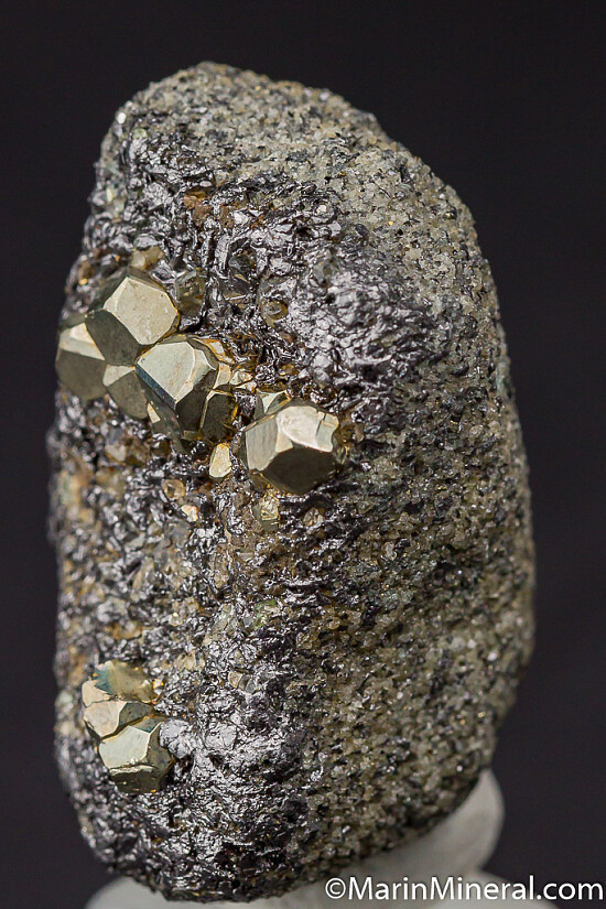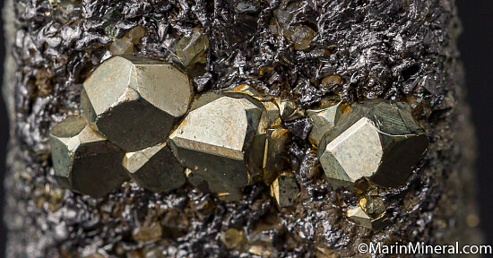 Crystals of Pyrite on Graphite. The Pyrite crystals formed with crystals of Graphite, all on massive Graphite. Merelani Pyrite is famous for it's high luster and complex forms. This specimen was found at the Merelani Tanzanite mines and a fine and less common matrix example.