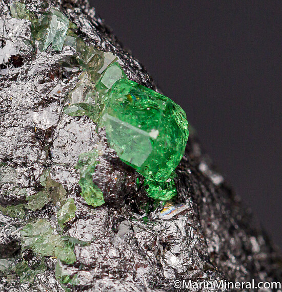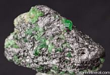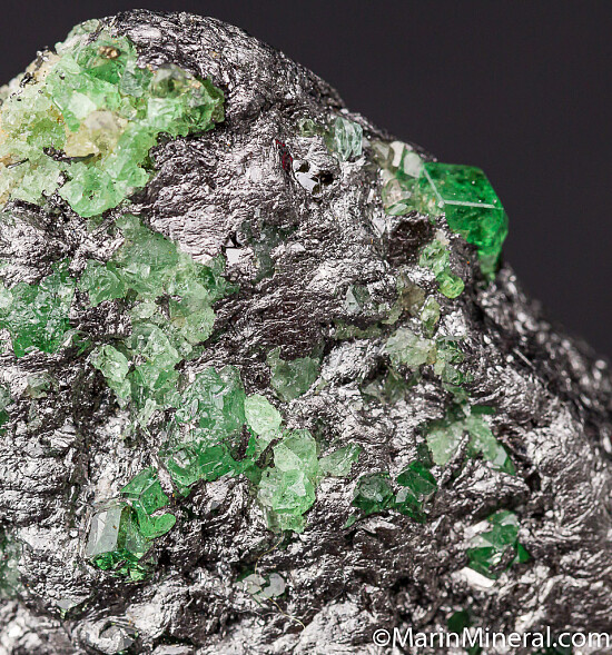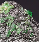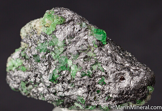 Glassy and transparent Tsavorite crystals to over 4mm on a Graphite matrix. Tsavorite is a chrome and vanadium rich variety of Grossular from East Africa and is one of the most valuable types of garnet found anywhere. Clean, less common matrix Tsavorite specimen.