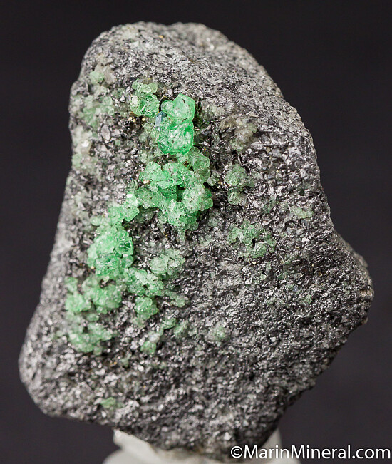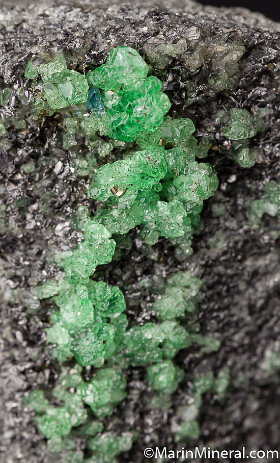 Glassy and transparent Tsavorite crystals in thick clusters on a Graphite matrix. Tsavorite is a chrome and vanadium rich variety of Grossular from East Africa and is one of the most valuable types of garnet found anywhere. Clean, less common matrix Tsavorite specimen.