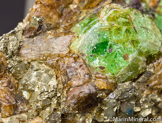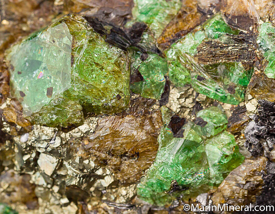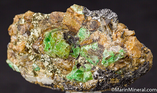 Green Grossular crystals known as 'Tsavorite' in a heavily crystallized matrix of what I believe to be brownish Diopside crystals, Pyrite, and Graphite. The main Tsavorite is 2cm in size. Neat and unusual piece valued at $350.