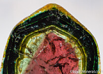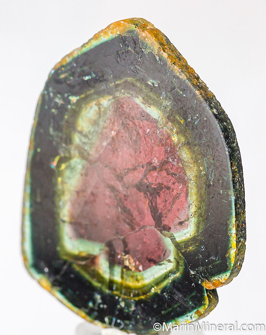 Cut and polished slice of Liddicoatite (a species of Tourmaline) from old finds in Madagascar. Cur parallel to the C-axis, the slice reveals the colorful interior of what would have appeared to otherwise be a dark crystal. Color bands of dark to light green surrounding a red, transparent central zone. Well polished on both sides, weighs 7.62 grams.