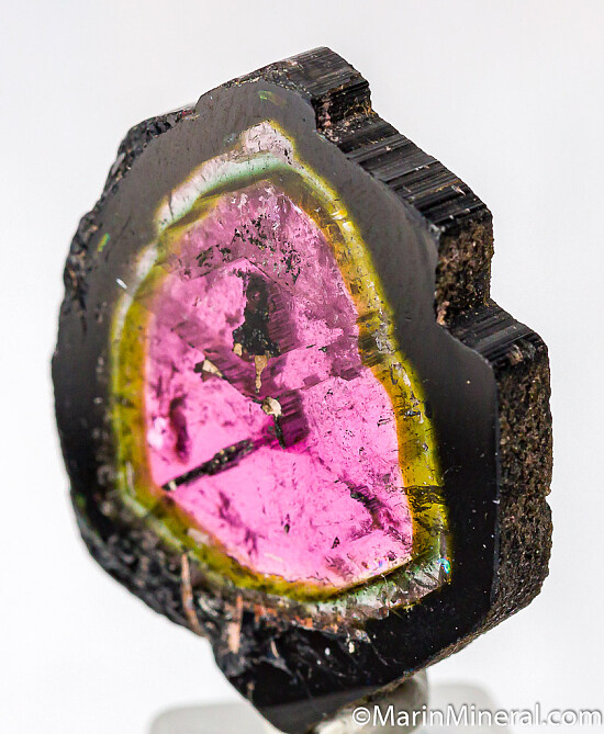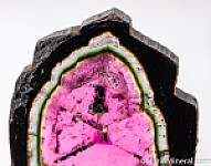Cut and polished slice of Liddicoatite (a species of Tourmaline) from old finds in Madagascar. Cut parallel to the C-axis, the slice reveals the colorful interior of what would have appeared to otherwise be a dark crystal. Dark rind followed by a clear zone, then a thin green zone, then finally a bright pink, transparent central zone. Well polished on both sides, weighs 6.58 grams.