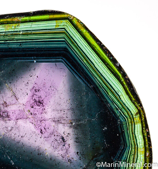 Cut and polished slice of Liddicoatite (a species of Tourmaline) from old finds in Madagascar. Cur parallel to the C-axis, the slice reveals the colorful interior of what would have appeared to otherwise be a dark crystal. This specimen has a green rind surrounding a dark blue interior with a triangular pink central zone. Well polished on both sides, weighs 5.45 grams.