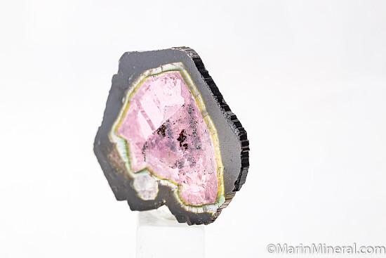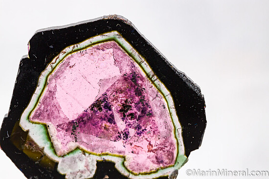 Cut and polished slice of Liddicoatite (a species of Tourmaline) from old finds in Madagascar. Cur parallel to the C-axis, the slice reveals the colorful interior of what would have appeared to otherwise be a dark crystal. Dark rind followed by a clear zone, then a thin green zone, then finally a bright pink, transparent central zone. Well polished on both sides, weighs 14.33 grams.