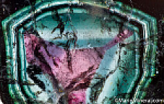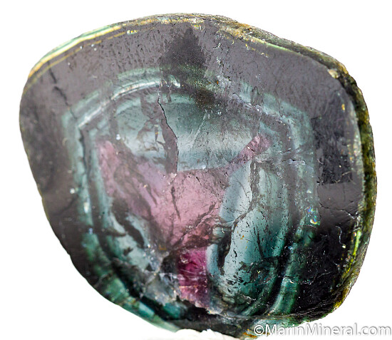 Cut and polished slice of Liddicoatite (a species of Tourmaline) from old finds in Madagascar. Cur parallel to the C-axis, the slice reveals the colorful interior of what would have appeared to otherwise be a dark crystal. Dark rind followed by blue and green color zoning, then finally a bright pink, triangular transparent central zone. Well polished on both sides, weighs 8.05 grams.