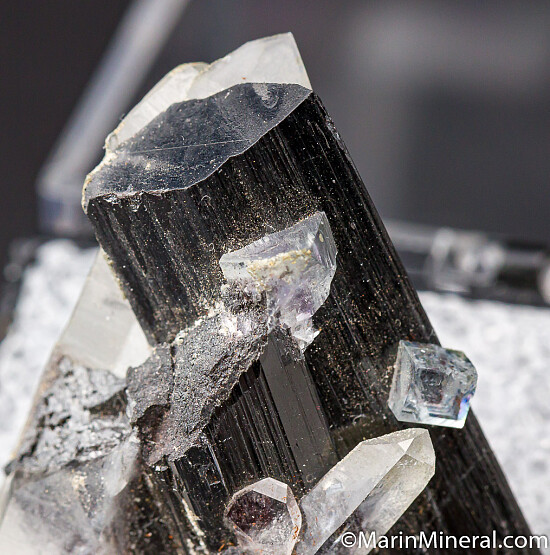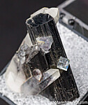 A very well formed single Ferberite crystals, with 2 partial crystals intergrown with Quartz crystals and adorned by small Fluorite crystals.