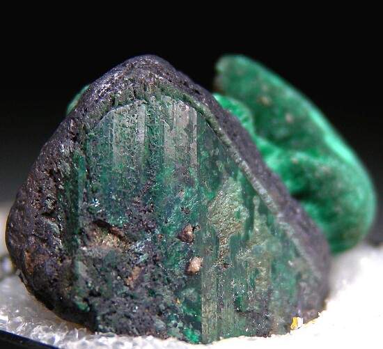 Unusual composite specimen of a Chalcocite crystal with a 'veneer' on the front face of Malachite after Azurite. A spray of fibrous Malachite extends off the right side.