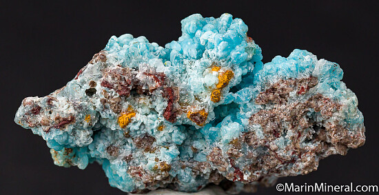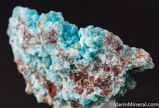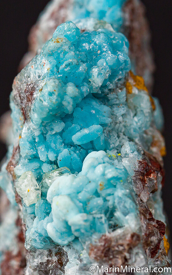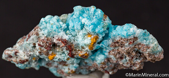 A beautiful and fairly new find of blue Hemimorphite from the M'fouati mine in the Congo. The botryoidal Hemimorphite grows on Willemite radial aggregates. There are also hydrozincite, Cerussite, and micro green-yellow crystals of what is probably Mimetite. Usually colorless, these blue Hemimorphites make showy specimens, and are highly interesting due to the associated minerals.