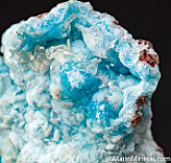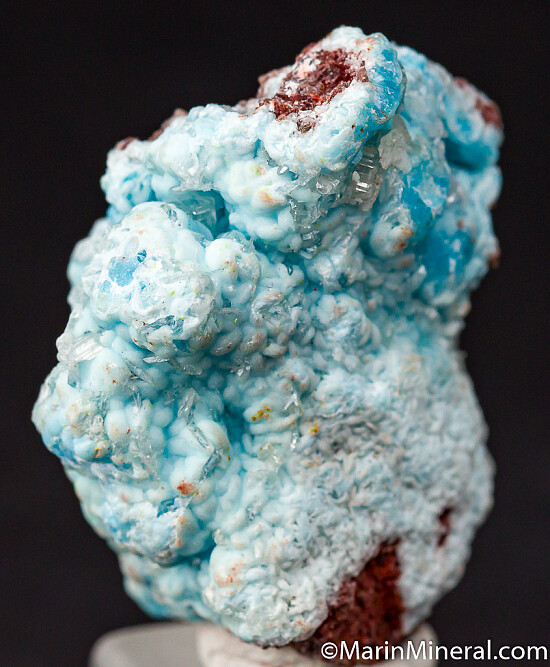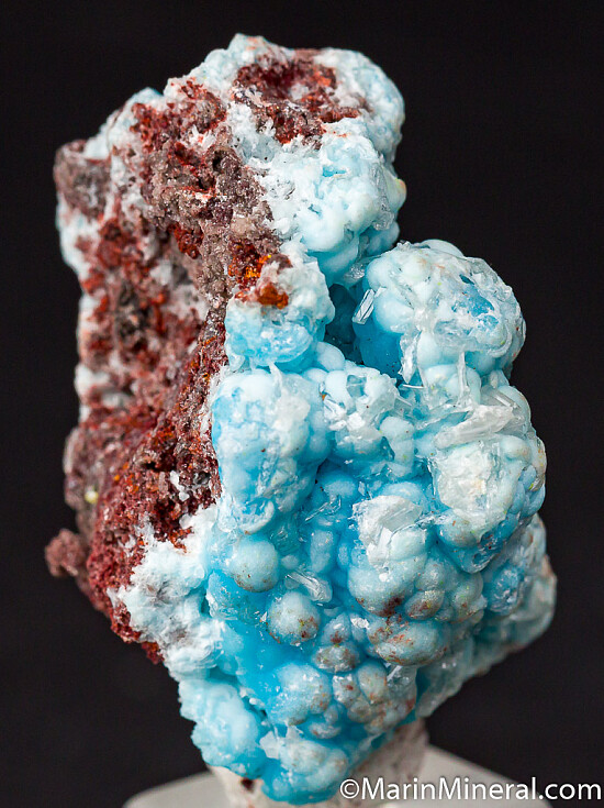 A beautiful and fairly new find of blue Hemimorphite from the M'fouati mine in the Congo. The botryoidal Hemimorphite is translucent with a pleasant blue color. Cerussite crystals are present atop the Hemimorphite. Usually colorless, these blue Hemimorphites make showy specimens, and are highly interesting due to the associated minerals.