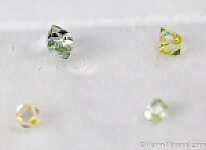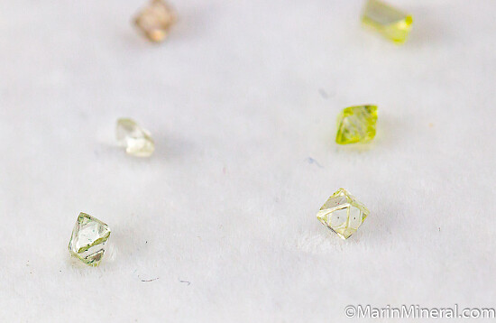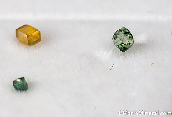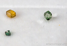 19 Diamond crystals from South Africa. A good mixture of different shapes, up to 3mm on edge (a couple are about 3.5mm). Small crystals but excellent luster, transparency, and colorful with some yellows and a blue. Total weight for the set is 1.5 carats. Note only 18 appear in the photo - a small clear triangular crystal was stuck to the lid of the case and missed out on the photo.