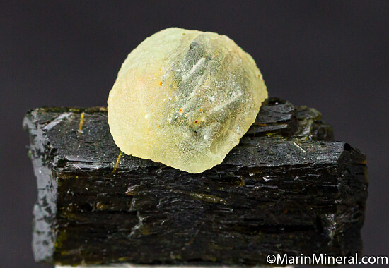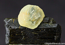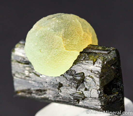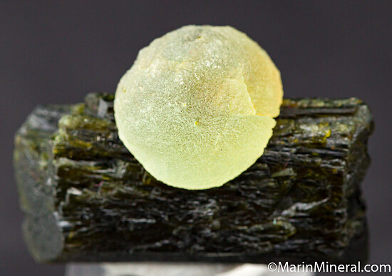 A double-terminated Epidote crystal with an attached sphere of transluscent green Prehnite. The Epidote is lustrous and perfect. Good quality, aesthetic specimen. This was hand selected for beauty and quality out of hundreds of specimens. An undamaged floater complete all around!