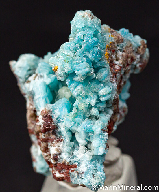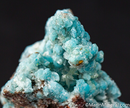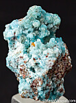 A beautiful and fairly new find of blue Hemimorphite from the M'fouati mine in the Congo. The botryoidal Hemimorphite grows on Willemite radial aggregates. Beautiful reticulated crystal groups of Cerussite grow protected in vugs. Usually colorless, these blue Hemimorphites make showy specimens, and are highly interesting due to the associated minerals.