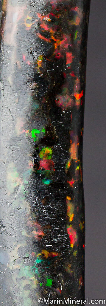 Black opal that has completely replaced a section of fossil Bamboo from recent finds in Java. It has a bright play of color (reds, blues, and greens) in areas.