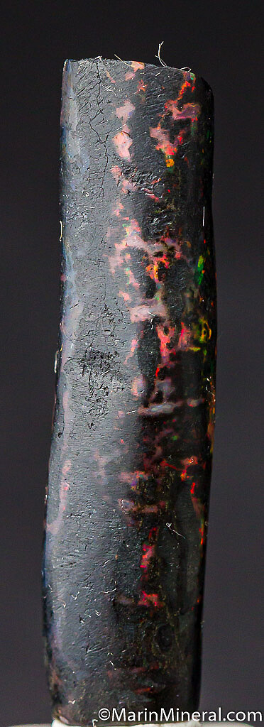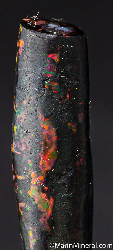 Black opal that has completely replaced a section of fossil Bamboo from recent finds in Java. It has a bright play of color (reds, blues, and greens) in areas.