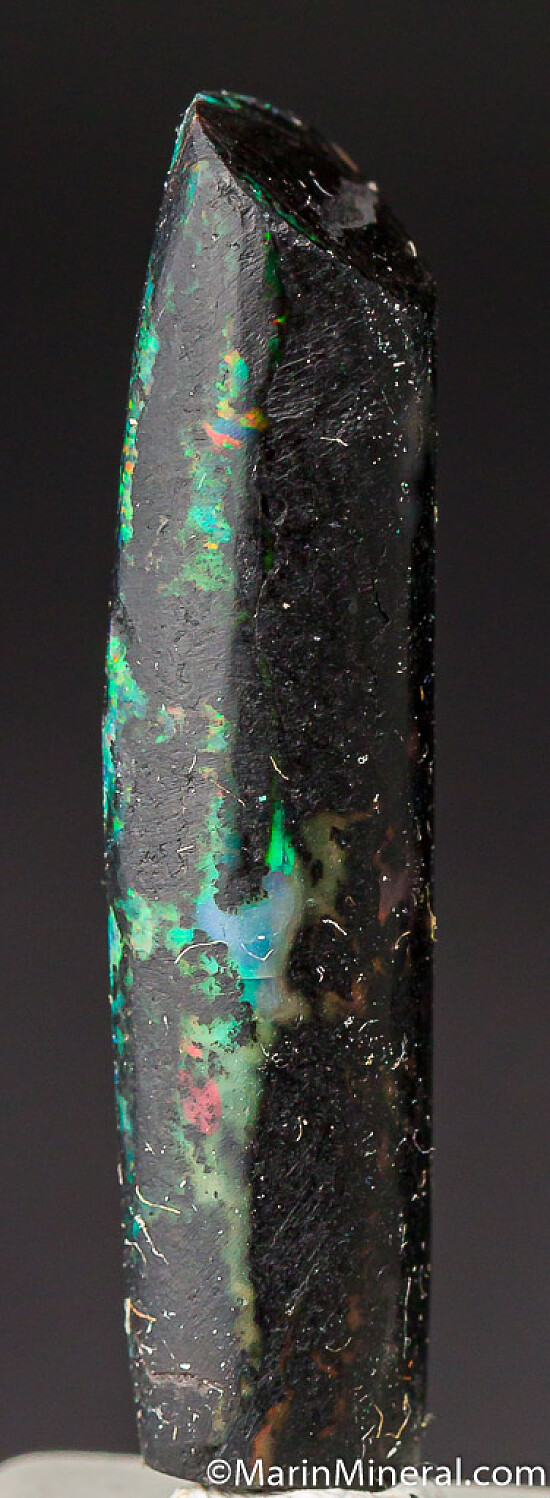 Black opal that has completely replaced a section of fossil Bamboo from recent finds in Java. The specimen is black with areas of bright color.