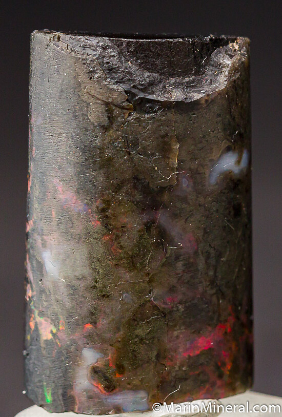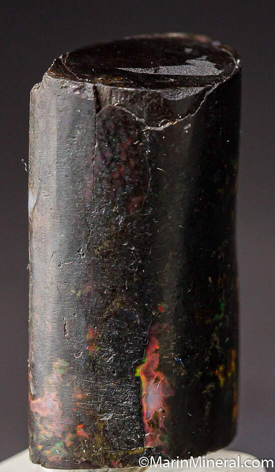 Black opal that has completely replaced a section of fossil Bamboo from recent finds in Java. The specimen is black with areas of bright color.