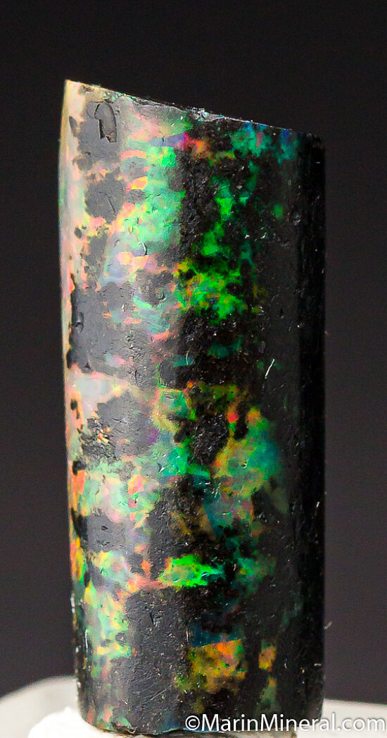 Black opal that has completely replaced a section of fossil Bamboo from recent finds in Java. The specimen is black with areas of bright color.