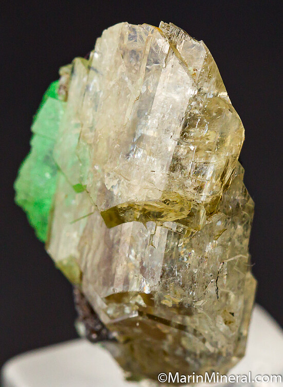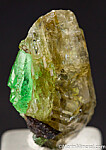Gorgeous, glassy double-terminated Diopside crystal with an attached crystal of Tsavorite. The Tsavorite is a stacked faden crystal group 1cm tall. There is also minor amounts of attached Titanite and Graphite. Stunning thumbnail from the famous Tanzanite mines of Merelani.