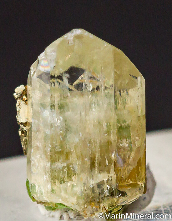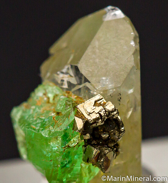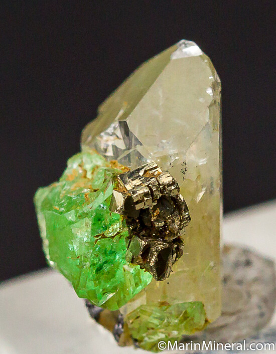 Bright 'mint' green Tsavorite crystals and Pyrite crystals on a terminated Diopside crystal. Fantastic small combination specimen from the Merelani Tanzanite mines.