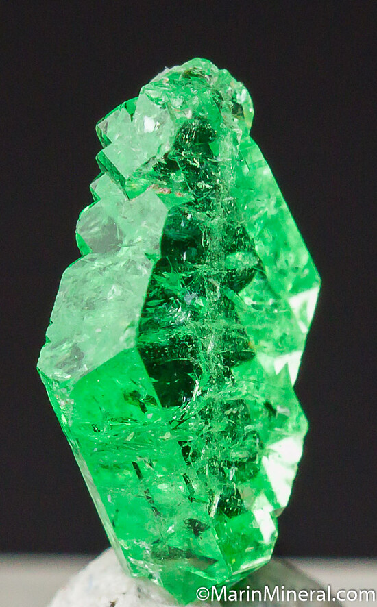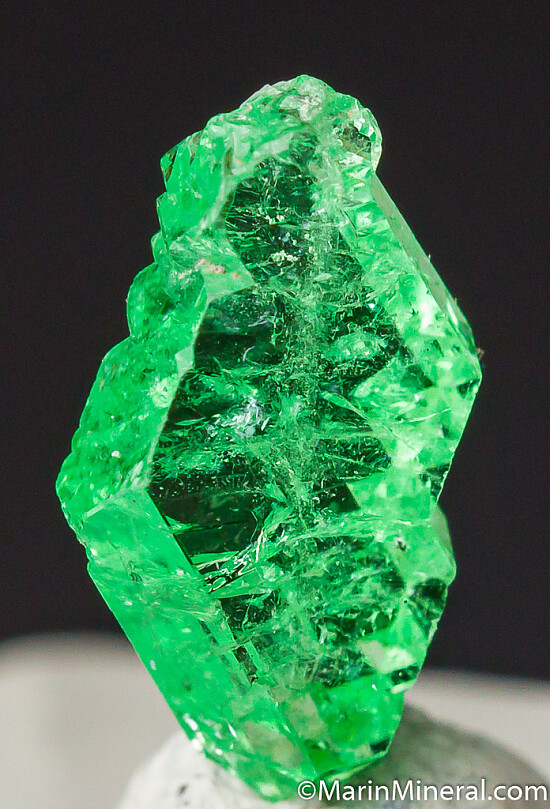 Small but fine quality Tsavorite crystal. Glassy and transparent with a distinct faden line running up the center. Complete and undamaged.