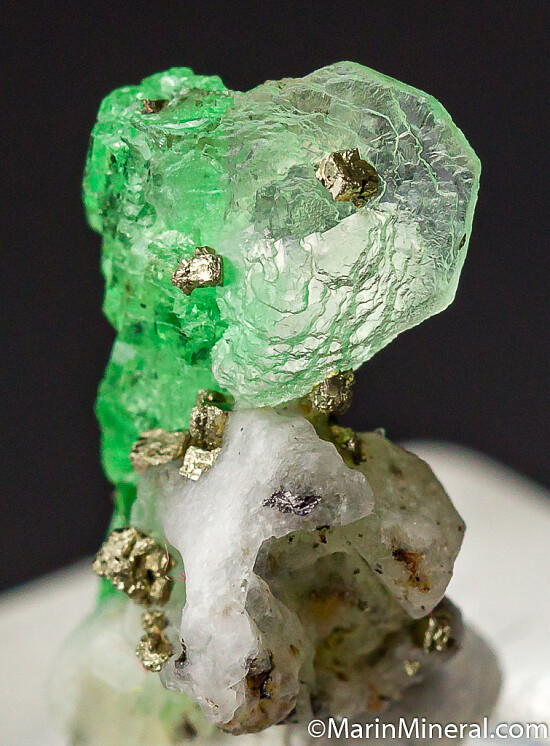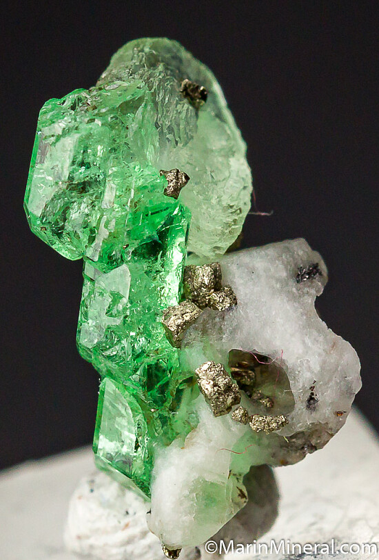 Gemmy stacked, faden style Tsavorite crystal group with an attached Prehnite crystal and small Pyrite crystals. Small but exceptional!!! Stunning thunmbnail from the famous Tanzanite mines of Merelani.