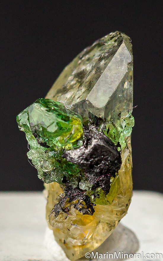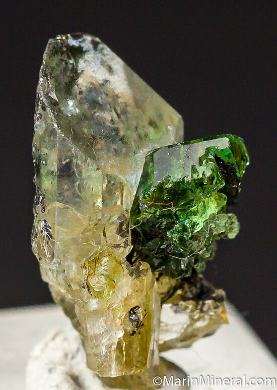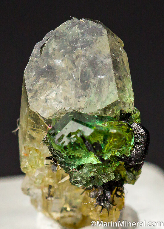 Gemmy green Tsavorite crystal attached to a glassy well terminated Diopside crystal. Complete all around and undamaged. Stunning thunmbnail from the famous Tanzanite mines of Merelani.
