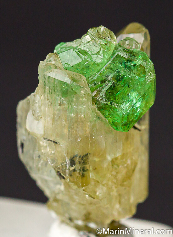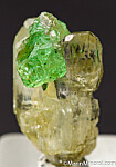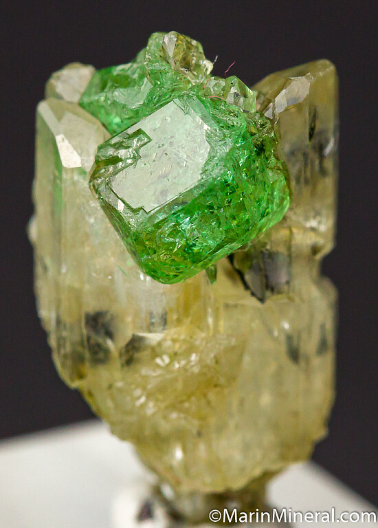 Glassy and gemmy green Tsavorite crystal, 6mm wide intergrown with a well terminated Diopside crystal. Stunning thunmbnail from the famous Tanzanite mines of Merelani.