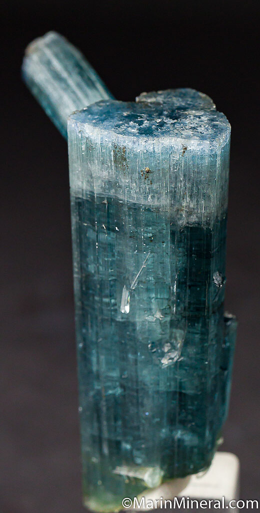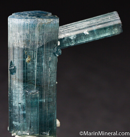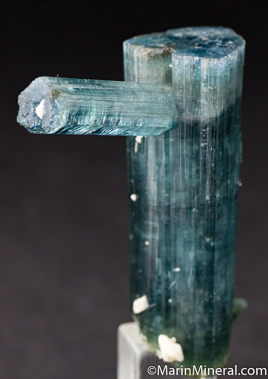A larger 6.4 x 2.2 cm blue Tourmaline crystal with a smaller crystal stuck out of the side. Both crystals are well terminated. A little different than your typical single crystals.