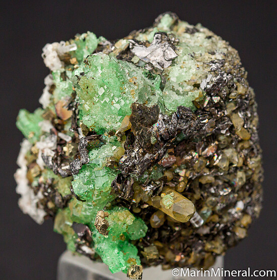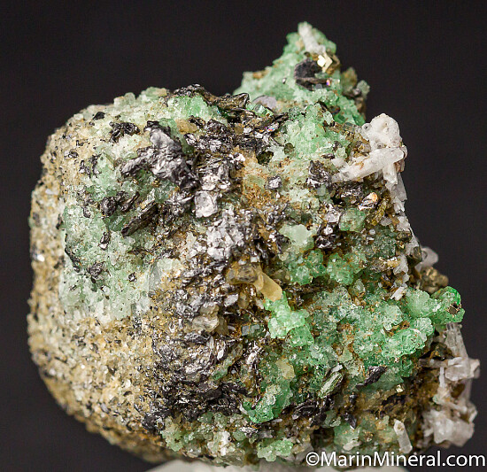 Classic Merelani combination of elongated Tsavorite (Grossular) crystals, white Calcite, Diopside, Pyrite and well formed Graphite crystals. Excellent display and study piece for the locality. The little Pyrite crystals perched atop the Tsavorite clusters are really nice!