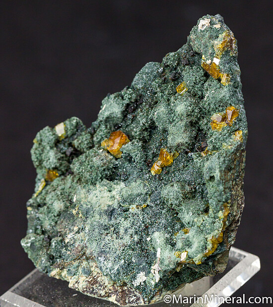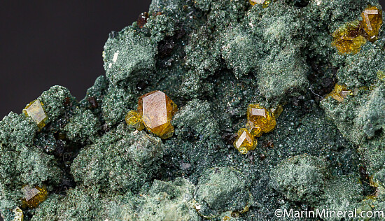 Golden Topazolite crystals on a matrix covered by dark green Clinochlore. Good sharp and glassy crystals to 5mm in size. The Yellow Cat Mine is located near the Benitoite Gem Mine and occassionally produces these fine quality garnets.